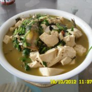 昂子鱼、豆腐、大蒜、香菜、辣椒、干红辣椒、大蒜子、生姜、酱油、生抽、醋、盐。