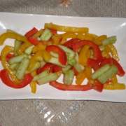 红彩椒、黄彩椒、茄子、盐、糖、鸡精、橄榄油。