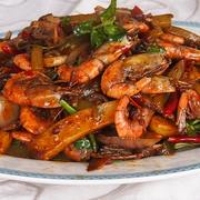 北极虾、洋葱、年糕、莴笋、芹菜、生姜、葱、五香粉、郫县豆瓣酱、干辣椒、花椒、大蒜、鸡精、生抽。