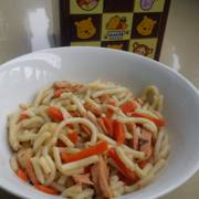 乌冬、火腿、红萝卜、金针菇、鸡肉、蚝油、酱油、食用油、盐。
