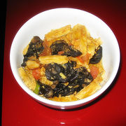 腐竹、西红柿、木耳、青椒、葱、蒜、盐、花椒粉、鸡精、味精、老抽。