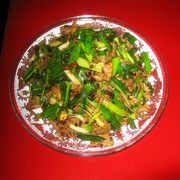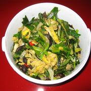 蒜苗、木耳、鸡蛋 、青椒、红泡椒、葱蒜、盐、花椒粉、酱油。