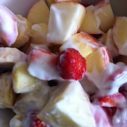 苹果、香蕉、草莓、伊利黄桃酸奶。