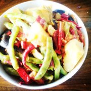 茄子、尖椒、土豆、西红柿、豆角、葱白、蒜、干辣椒、炖肉料、盐、生抽、老抽、糖。