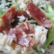 稻花香米、腊肠、小油菜、姜片、豉油、鱼露、生抽、白糖、香油。
