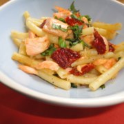 三文鱼、意式面条、九层塔、大蒜、番茄干。