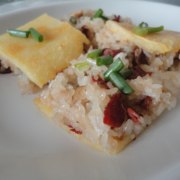大米、绿豆粒、糯米、火腿、香菇、小葱、卤豆腐干、鸡蛋、洋葱。
