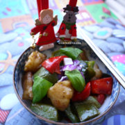 安康鱼、红甜椒、绿甜椒、紫洋葱、大蒜、生姜、金不换、生抽、老抽、蚝油、料酒、淀粉、盐、现磨黑胡椒粉。