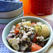羊后腿肉、红萝卜、土豆、小茴香根、薏米、迷迭香碎、百里香碎、调味酒、香醋、高汤、现磨黑胡椒碎、盐、橄榄油、生姜、大蒜、洋葱、口蘑、芹菜。