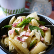 意大利面条、腊肉丁、薄荷叶、杏仁碎片、橄榄油、现磨黑胡椒粒、淡奶油、盐、大蒜、帕马森乾酪。