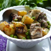 羊后腿肉、土豆、豌豆、孜然粉、香芹粉、桂皮、白葡萄酒、柠檬汁、高汤、现磨黑胡椒、盐、黄油。
