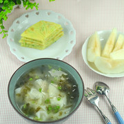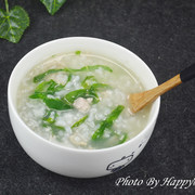 大米、水、肉丝、青菜、盐、淀粉、生抽、鸡精、香油。