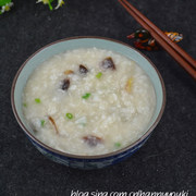 白粥、瘦肉、皮蛋、香菇、生姜、盐、淀粉、酱油、葱花、香油。