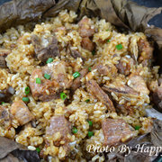 排骨、糯米、荷叶、盐、糖、老抽、料酒、淀粉、黑胡椒粉、姜末。