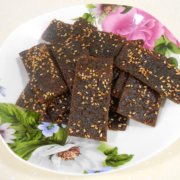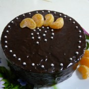 蛋糕体:蛋白、白糖、低筋面粉、玉米淀粉、白醋、盐、蜜豆、巧克力淋酱:黑巧克力、淡奶油、牛奶、黄油、装饰:砂糖橘、银糖粒。