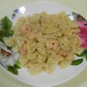蝴蝶面、盐、黑胡椒碎、米酒、葱末、黑胡椒、虾仁、大蒜、高汤、奶油白酱、鲜奶油、橄榄油。