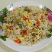 熟米饭、胡萝卜、豌豆、香菇、虾仁、鸡蛋、盐、鸡精、米酒、色拉油。
