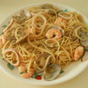 意大利面、鱿鱼、大蒜、洋葱、蛤蜊、白酒、盐、胡椒粉、淡奶油、橄榄油、虾仁。