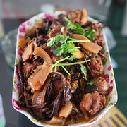 小笨鸡、野生榛蘑干、葱、姜、蒜、大料、老抽、料酒、白糖、精盐。