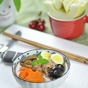 挂面、猪肉、葱、胡萝卜、黑木耳、盐、生抽、淀粉。