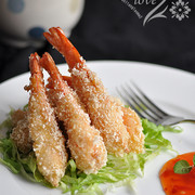 虾、白胡椒粉、盐、花雕酒、淀粉、面包糠、鸡蛋、油。