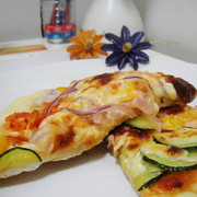 高粉、酵母、温水、盐、白糖、匹萨酱、芝士、腊肠、培根、北极虾仁、黄瓜、洋葱、彩椒、油。