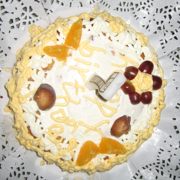 面粉、鸡蛋、酵母粉、白糖、盐、黄油、葡萄干、奶油、橘味果冻粉、贝壳巧克力、葡萄、橙子。