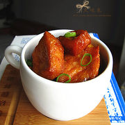 带皮五花肉、腐乳汁、老王头酱肉包、葱、姜、冰糖、白酒、老抽、生抽。