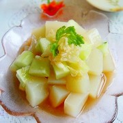 冬瓜、豆腐、泡发海带丝、植物油、小葱、香油、水淀粉、盐、生抽、醋、味精。