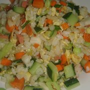 米饭、鸡蛋、胡萝卜、黄瓜、火腿肠、山药、小虾米、葱、姜、花生油、食盐。
