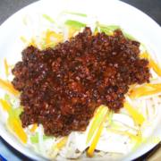 肉末、甜面酱、清水、京葱、老抽、绿豆芽、青笋尖、胡萝卜、豆腐皮、面条、大蒜、醋。