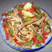 红柿椒、青线椒、肉丝、香菇、面条、葱、蒜、姜。