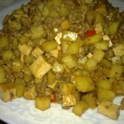 肉末、土豆、香干、大蒜 生姜、辣椒、盐、鸡精。
