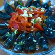 皮蛋、大红椒、香菜、大蒜仔、生姜、盐、鸡精、糖、陈醋、生抽。