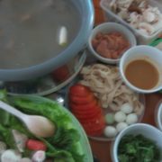 排骨、羊肉卷、冻豆腐、西红柿、千张皮、鹌鹑蛋、生菜、香菇、口蘑、小野生菌、东芝酱油、腐乳、蒜蓉、红油、野山椒、香菜碎。