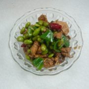 毛豆、鸡肉、青椒、葱、姜、蒜、红辣椒。