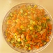 胡萝卜、青瓜、玉米粒、瘦肉、鸡精、料酒、油、盐、酱油、生粉。