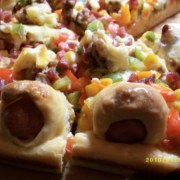 面粉、洋葱、干酵母、温水、西红柿、玉米、彩椒、鸡腿肉、火腿、小圆肠。