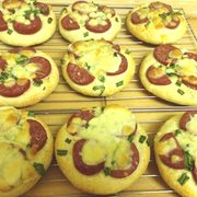 面粉、豆渣、鸡蛋、白糖、盐、酵母、橄榄油、鸡蛋清、葱花、香肠片、马苏里拉奶酪。