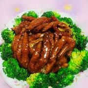 鸡爪、西兰花、葱、姜、盐、鸡粉、糊椒粉、料酒、蚝油、生抽、水淀粉。