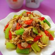 西芹、瘦肉、豆皮、青红辣椒、葱、蒜、盐、料酒、生抽、老抽、鸡粉、生粉。