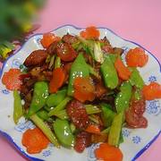 荷兰豆、香芹、胡萝卜、香肠、腊肉、姜、葱、蒜、盐、鸡粉、料酒、鸡粉。