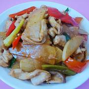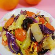 西芹、干笋、黄花菜、豆皮、黑木耳、生菜梗、银耳、年糕、紫椰菜、姜、蒜、盐、鸡粉、蚝油。