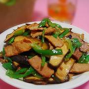 龙井茶香豆干、盐瘦肉、青椒、姜、葱、蒜、盐、料酒、老抽、鸡粉。