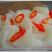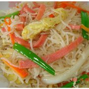 米粉、大白菜梗、火腿、鸡蛋、胡萝卜、葱、油、盐、生抽、鸡粉。
