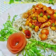 挂面、鸡胸肉、西红柿、玉米豌豆粒、盐、番茄酱、鸡精、洋葱。
