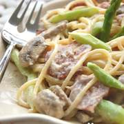 意面、芦笋、蘑菇、洋葱、鲜奶、淡奶油、培根、面粉、黄油、罗勒。
