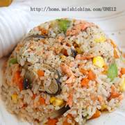 三文鱼肉、黑胡椒粉、柠檬汁、盐、丝瓜、胡萝卜、草菇、甜玉米粒、隔夜米饭、虾油、鸡精。