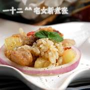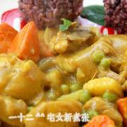 鸡块、洋葱、豌豆、咖喱块、椰汁。