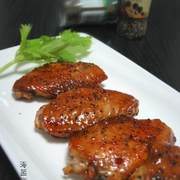 鸡翅中、朗姆酒、李锦记老抽、海天金标生抽、黑胡椒碎、黑胡椒粉、大蒜粉、小辣椒粉、盐。